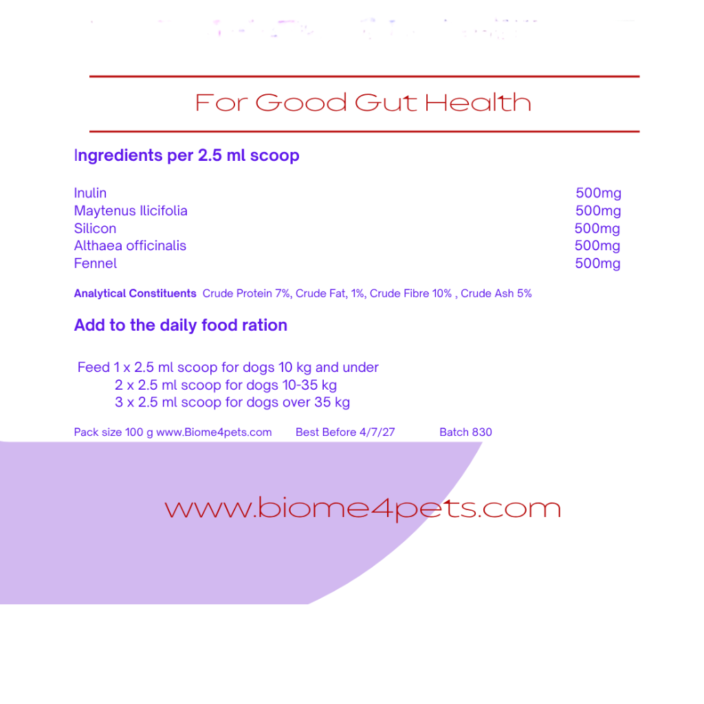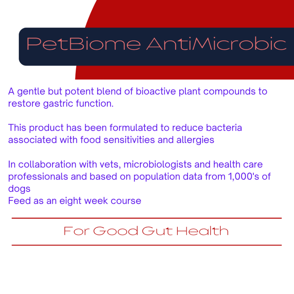 This product is formulated to help reduce the bacteria associated with inflammation, pain and discomfort as identified by the Biome4Pets Analysis and report. The featured ingredient is Maytenus Illicifolia backed by numerous scientific papers for its use in gastric health. Plant antimicrobials are especially effective because they prevent the formation of biofilm bacteria. Biofilm formation increases the permeability of the gut and causes a loss of function of the intestinal barrier, causing gastric imbalances or dysbiosis.
