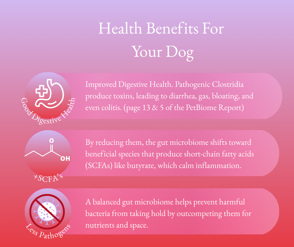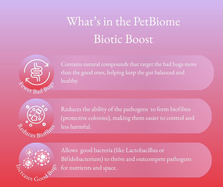 As recommended in the Biome4Pets Report. The Biome4Pets analysis and report has identified an increase in pathogenic bacteria associated with the gastric imbalance highlighted for your pet. This product has been scientifically formulated to reduce specific pathogenic bacteria within the microbiome of your pet.