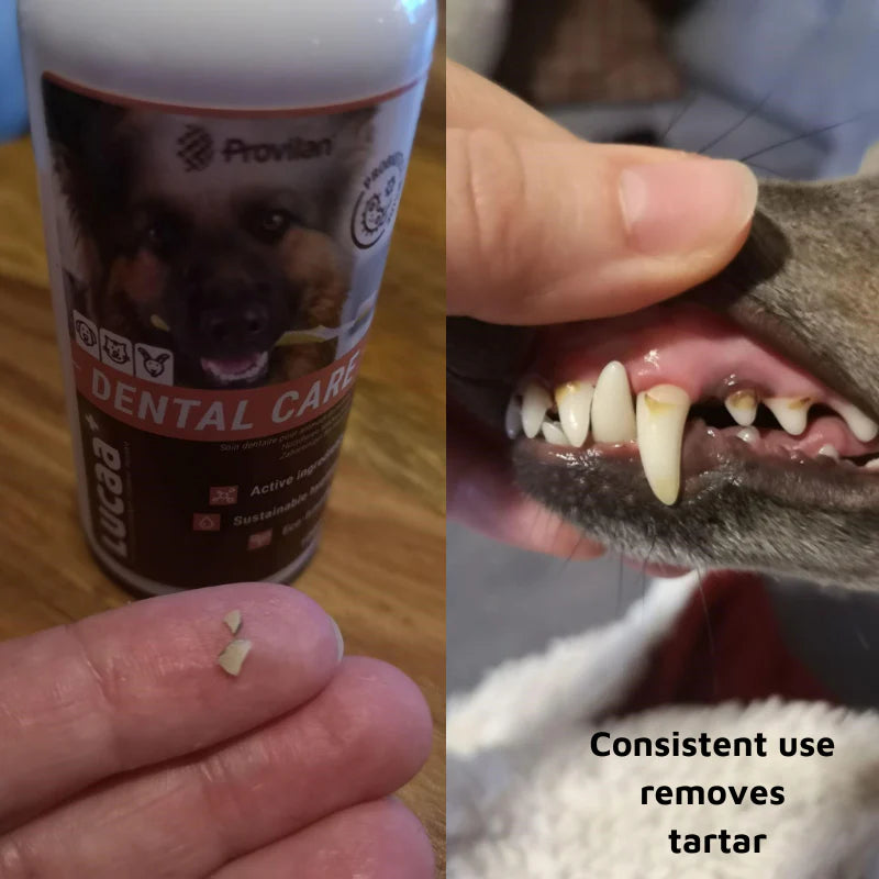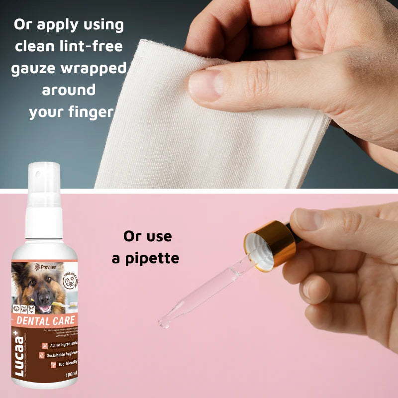 Shake before use. LUCAA+ Probiotic Pet Dental Care Spray lightly once or twice a day directly onto teeth. Use a pipette if preferred. For best results ensure tartar is first removed by a vet – particularly in older animals.