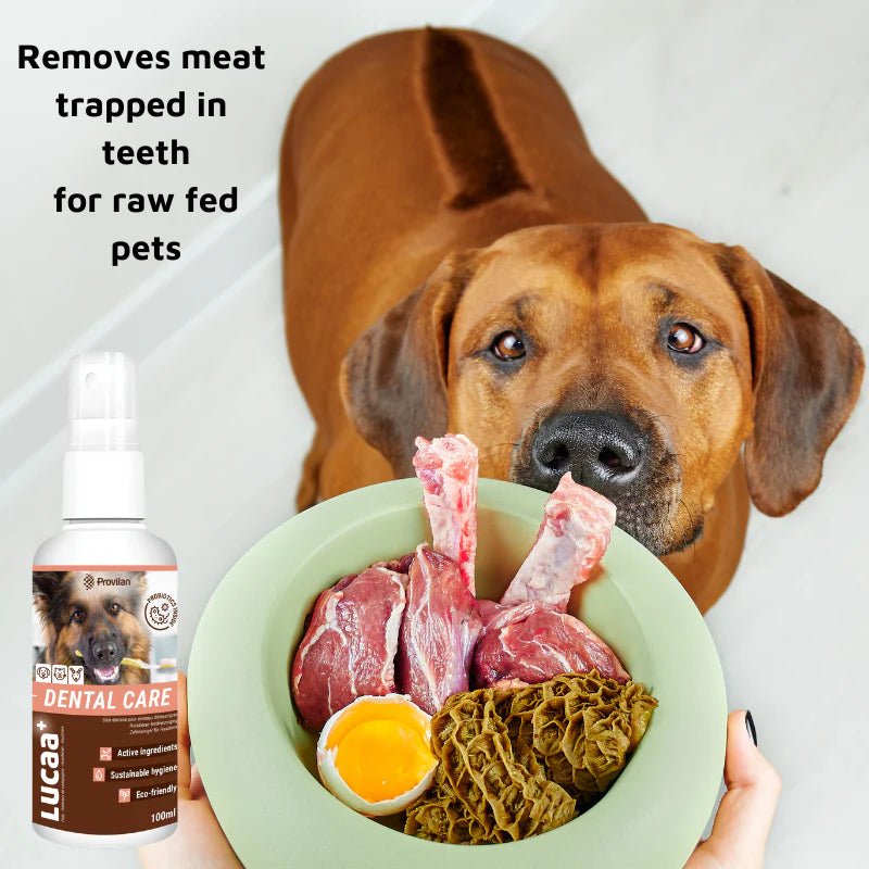 LUCAA+ Probiotic Pet Dental Care is an ideal dental spray for dogs and cats that are raw fed. This is because the spray eliminates organic molecules and food matter that promote tartar deposits and cause bad breath.